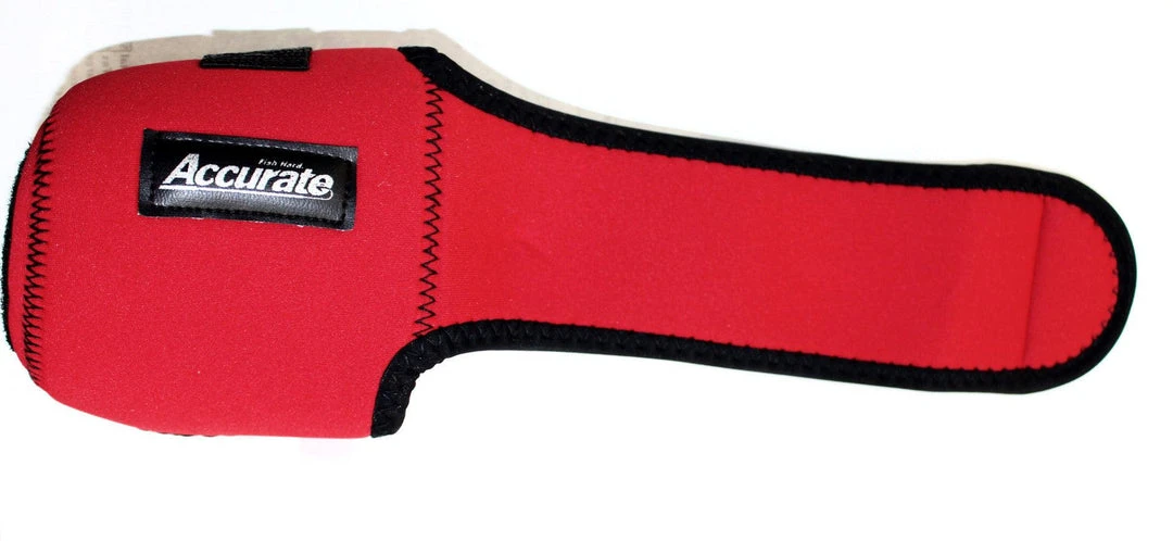 Accurate Reels has developed a custom reel cover for your reel that fits like a glove. It’s made from neoprene and features a heavy duty composite ring for hooking lures or hooks when used on a rod and reel. The rear cover wraps around the back of the reel or rod and secures it so it won’t get lost. It features the accurate logo and signature red and black for a sleek look.