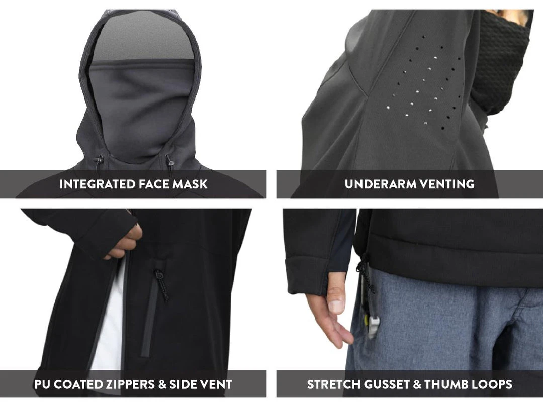 The Aftco Reaper 3-Layer Windproof Softshell Jacket constructed from a durable stretch soft shell rip-stop fabric with an ultra-warm Hexatron™ fleece lining and integrated micro-fleece face mask.