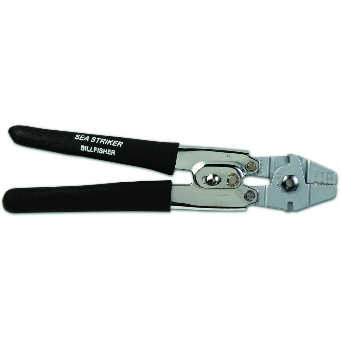 The Billfisher Hand Crimper ECN10Â is a three-position tool crimps wire and mono from 50 lb. to 450 lb. test. Complete with hardened side cutter. The perfect tools for a professional crimp on Sea Striker double sleeves. The Deluxe models feature special heat treated satin finish jaws and chrome handles for maximum corrosion resistance. Clam-packed individually.