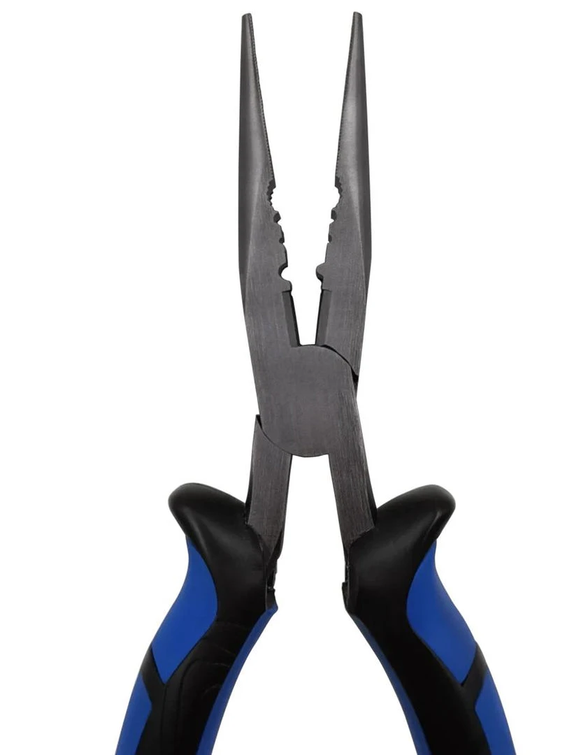 Mustad 8″ Straight Nose Pliers are perfect for removing hooks, crimping, or cutting line. Built with functionality in mind, these pliers feature a line and wire cutter, and a crimper for sleeves and lead. Textured jaws ensure great grip when removing hooks. These pliers are constructed with drop-forged high carbon steel and finished with Black for great saltwater corrosion resistance. Durable double-moulded handles add comfort and a secure grip.