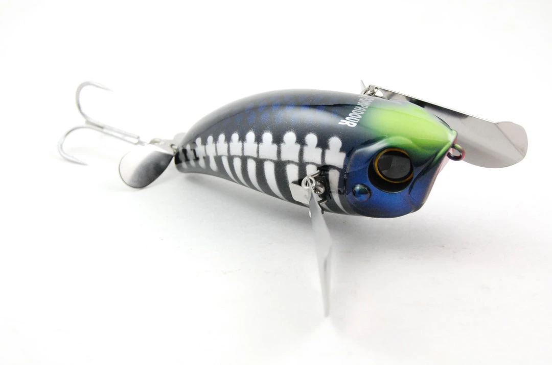 On the rear of the bait there is a pivoting propeller that slides back and forth creating a deep gurgling sound and leaving a tantalizing trail of bubbles. This, combined with the metal wings and the bulky body of the bait means that this lure displaces A LOT of water and will call fish up from even the deepest depths.