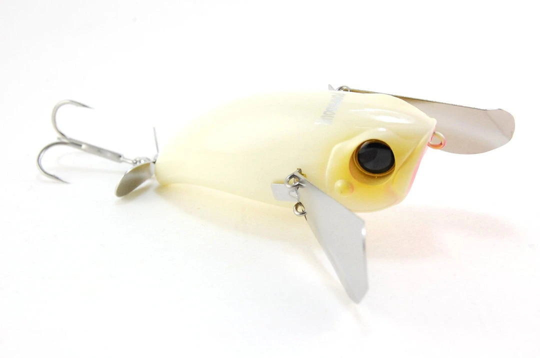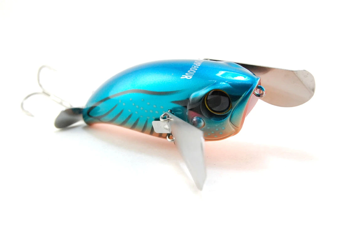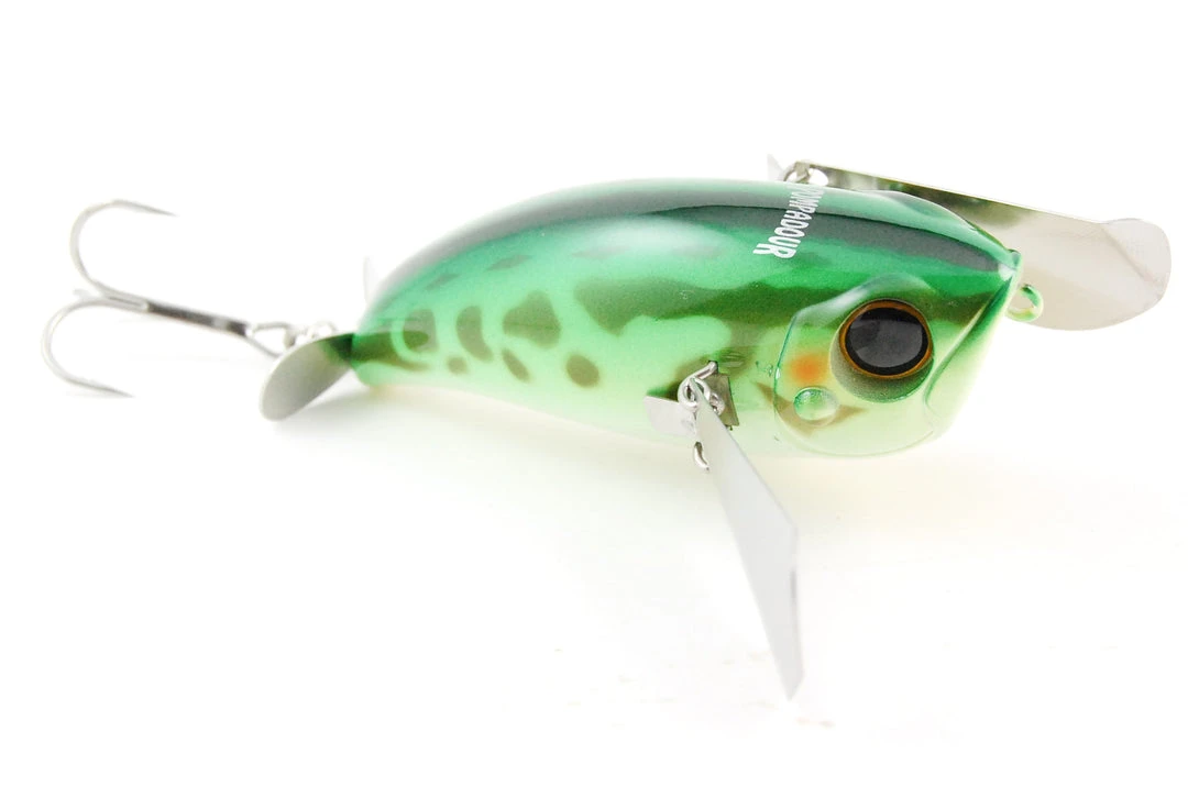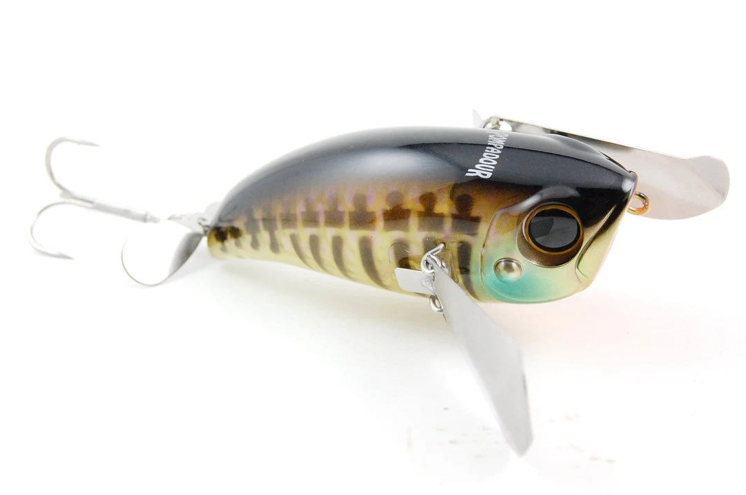 The Jackall Pompadour features two unique metal wings that, upon casting, tuck away tight to the body for those long casts. Once the lure hits the water and you begin the retrieve, the metal wings open up creating a very unique wobble and a huge wake.
