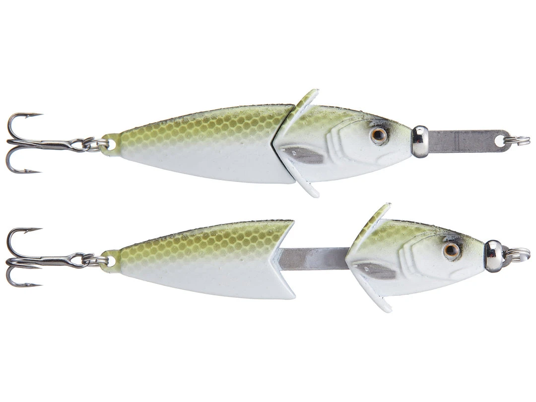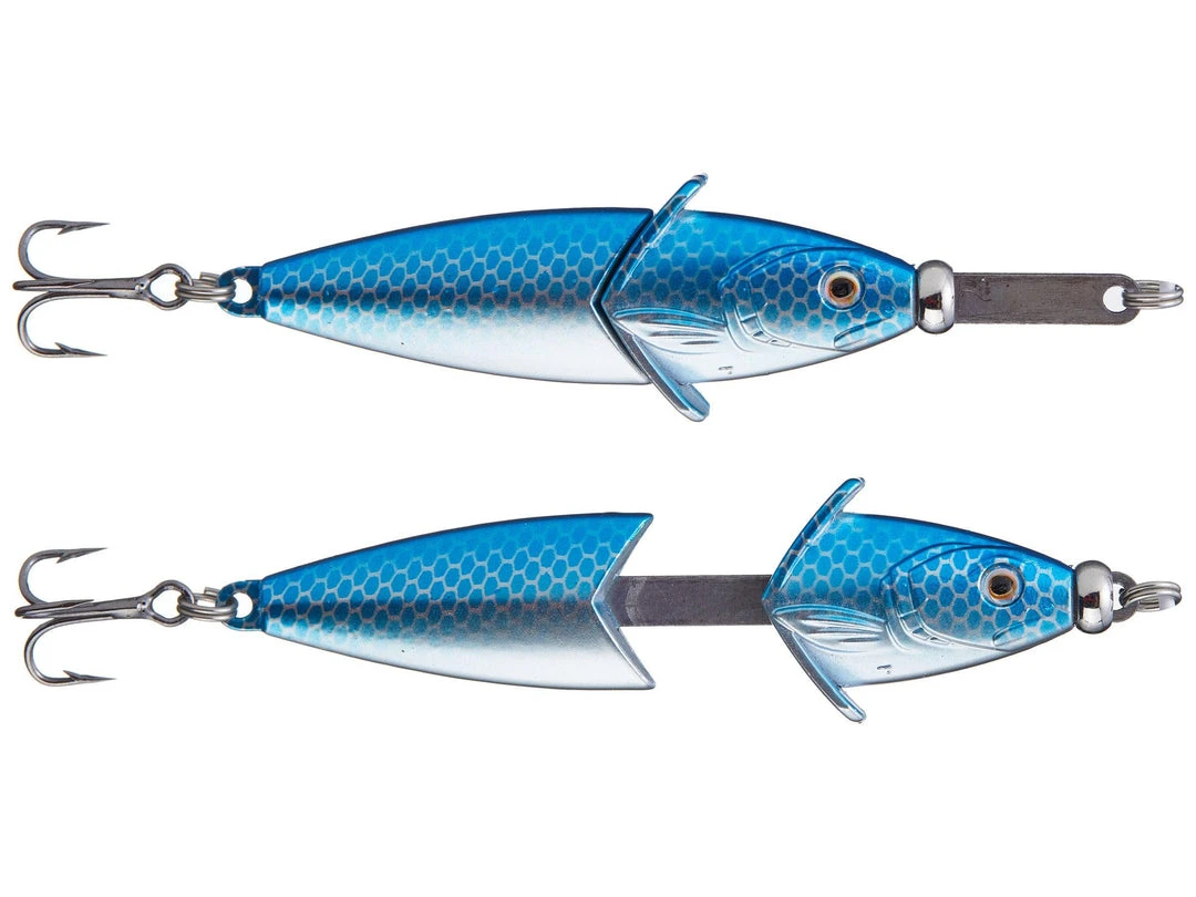A vertical jigging spoon created to draw schooling fish in from greater distances, the Lunkerhunt Knocking Jigging Spoon is designed to separate and knock together when jigging to produce a unique metallic acoustic that fish simply can’t resist. Featuring an innovative internal harness that runs through the body of the bait, a twitch of the rod tip sends the head of the spoon down the harness to clack emphatically against the tail section.