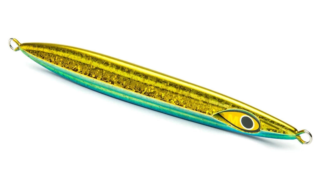 Mustad’s Rip Roller Slow Fall Jig has a slim, streamlined profile for quick descent on a tight line. Its centered weight gives it a stable but rolling motion on a slack line.