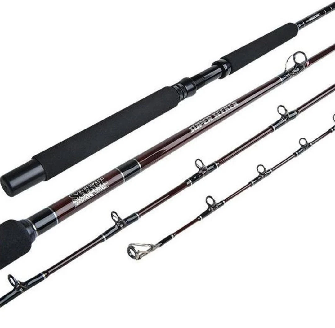 The Super Seeker Rods are made with a combination of graphite and S-glass creating a composite material that is superior to any saltwater rod on the market. The properties of S-glass boast 40% increased tensile strength and 20% modulus than standard E-glass. Coupled with the lightweight but stiff graphite, each Super Seeker Rod is built to shut off at just the right spot to give the angler the maximum lifting power. The Super Seekers are built with Fuji TiChrome SIC Guides, hypalon grips, and aluminum reel seats.